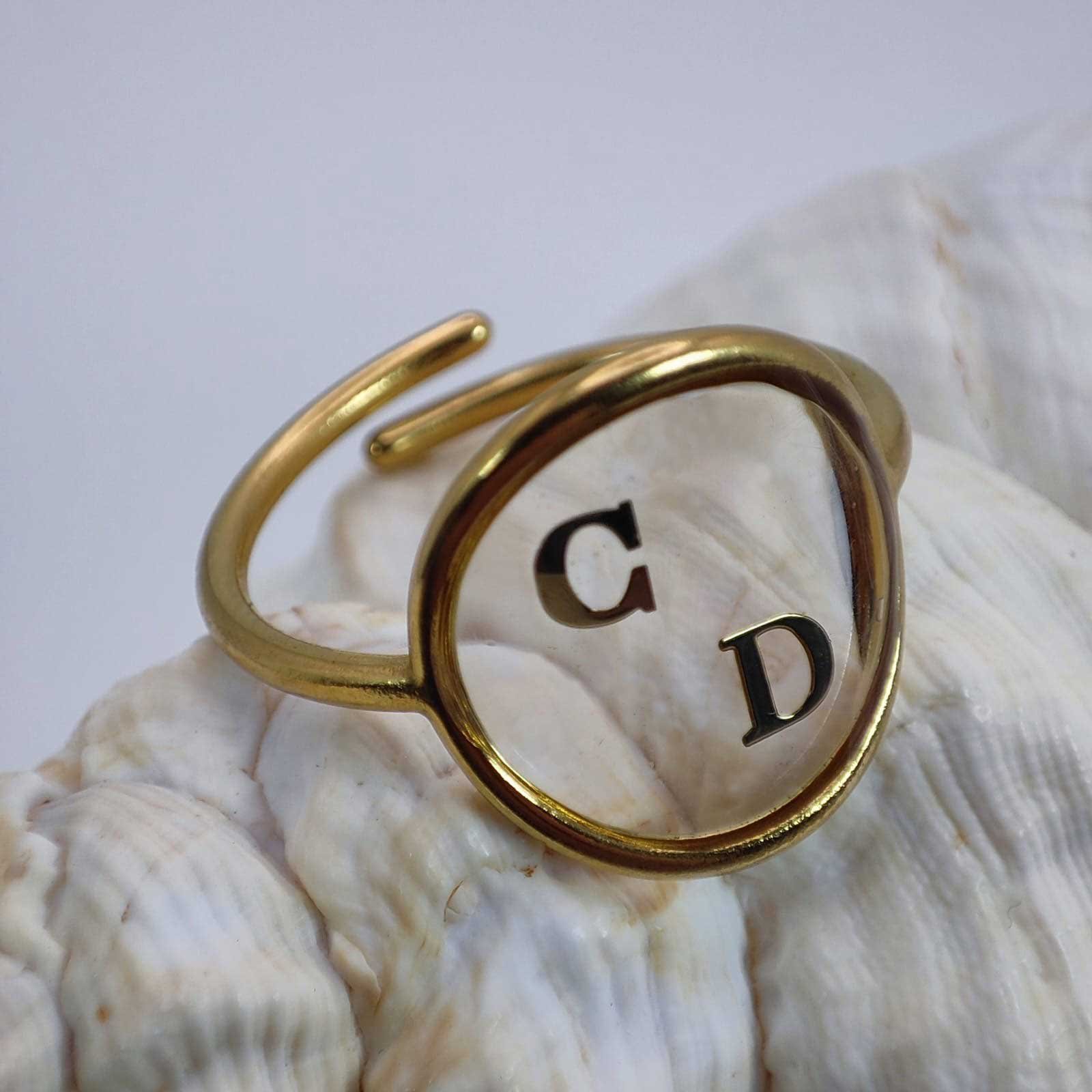 En acier inoxydable 304L doré, cette bague résiste à l’eau et au ternissement. La résine transparente, coulée à la main, protège la lettre dorée tout en créant un effet de légèreté et de profondeur. Sa surface lisse et brillante capte la lumière avec subtilité.