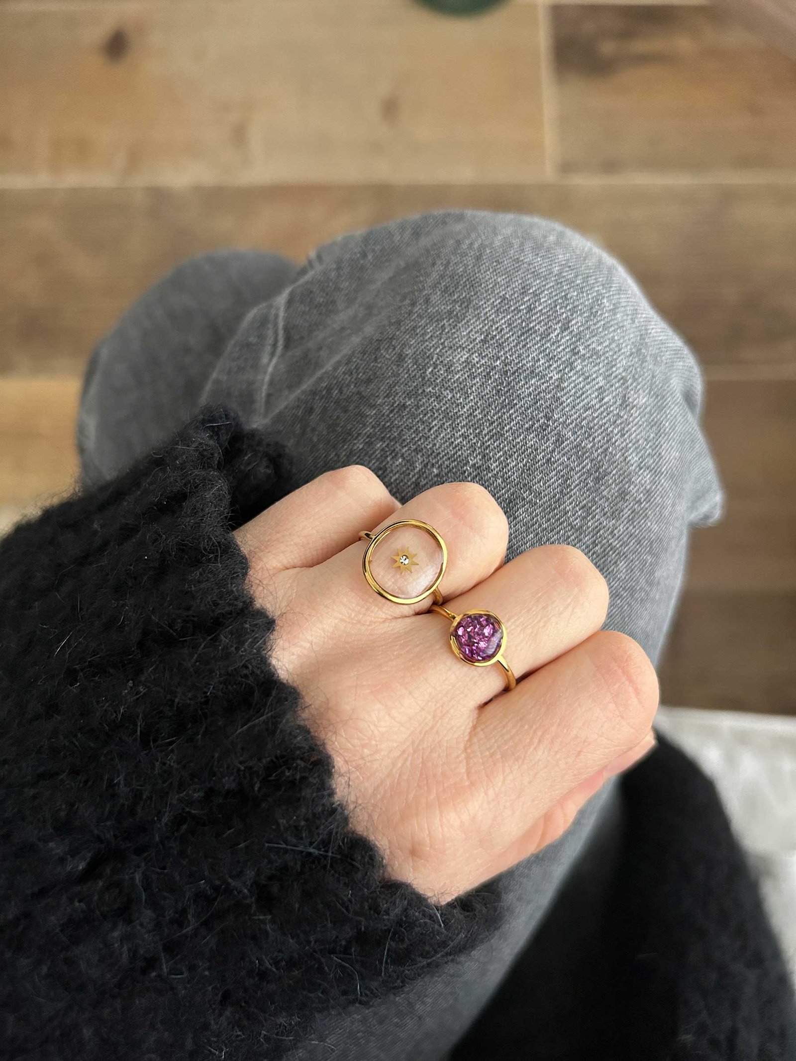 Chaque Bague Paris – Lavande est réalisée à la main dans mon atelier en France. Je commence par couler la résine avant d’y incruster manuellement de fins éclats de verre violets.
