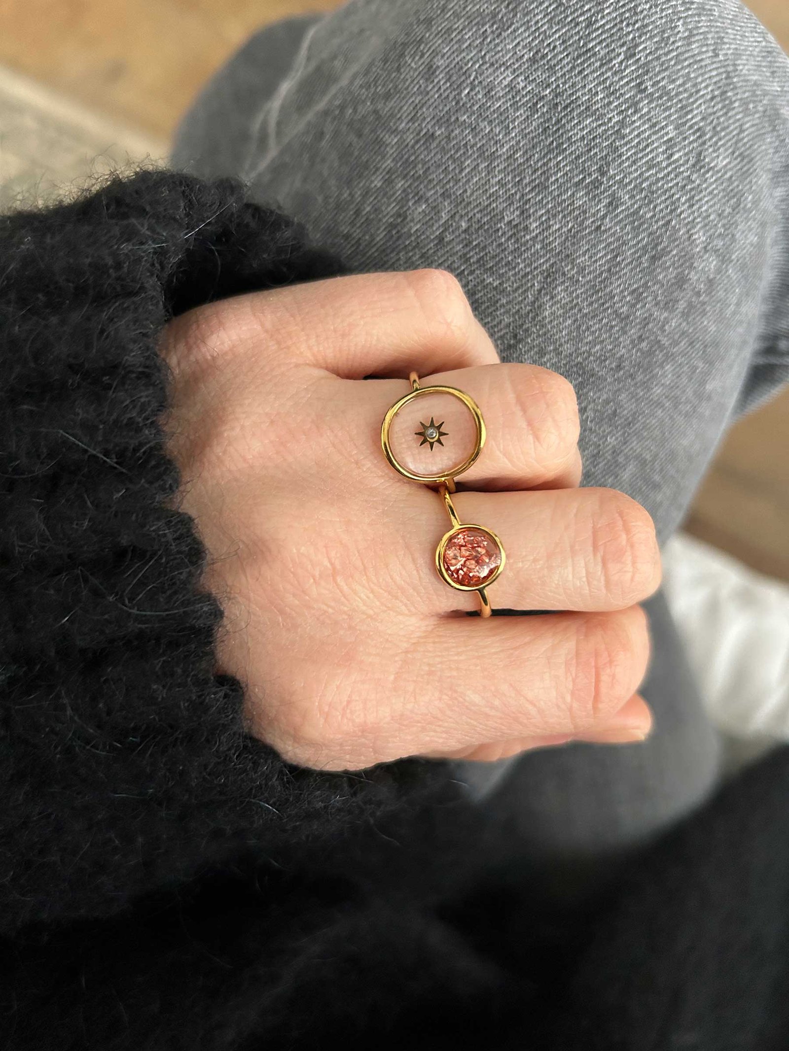 Chaque Bague Paris – Rosée est réalisée à la main dans mon atelier en France. Je coule la résine avec soin avant d’y incruster manuellement de fins éclats de verre roses.