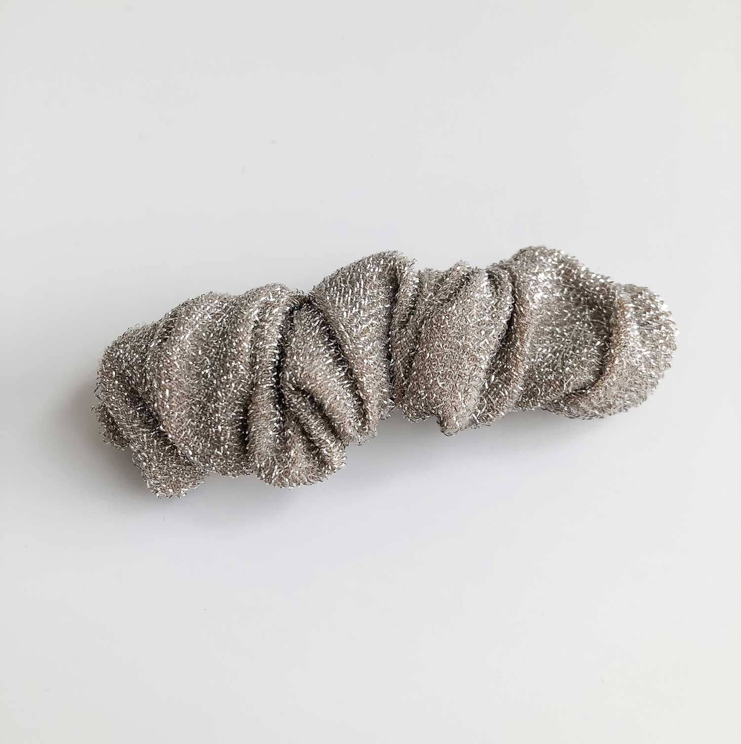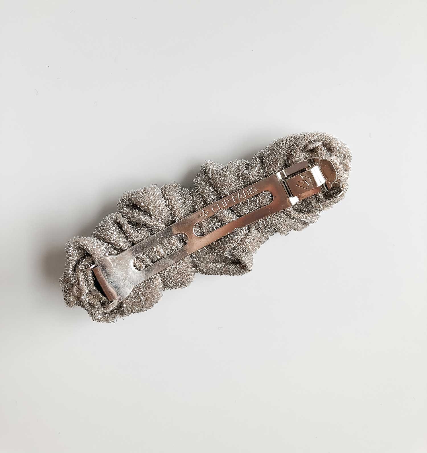 La Barrette Scrunchie est délicatement cousue à la main sur une barrette à clip en métal argenté.