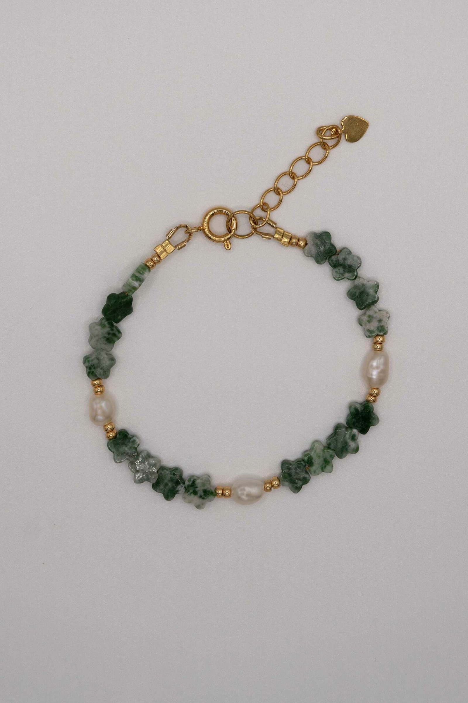 Les petites fleurs en pierre naturelle rappellent la croissance et l’équilibre. Le vert du Quartzite, symbole de stabilité émotionnelle et de paix intérieure, se marie à la lumière douce des perles d’eau douce. Ensemble, elles créent un contraste harmonieux, à la fois apaisant et raffiné.
