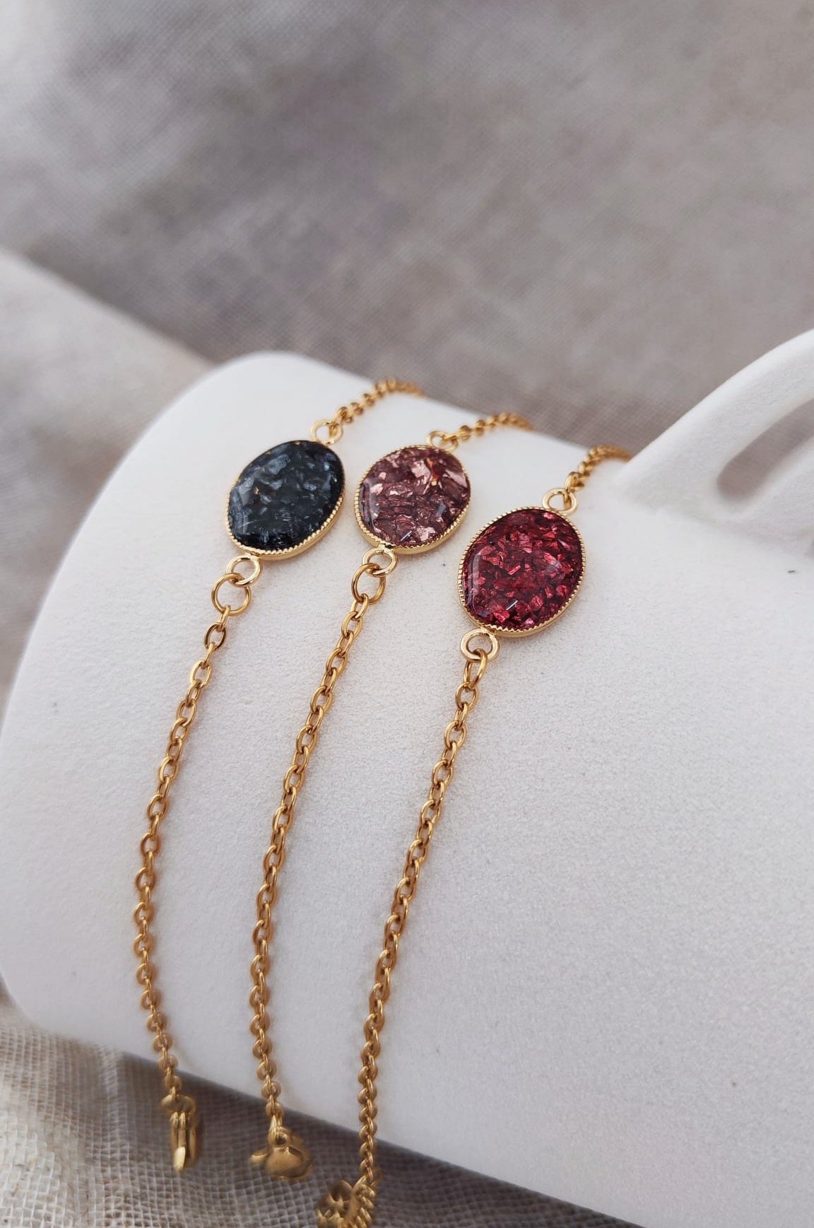 Au centre du bracelet, un intercalaire en laiton doré à l’or 18k accueille une résine rouge incrustée de cristaux. Ce jeu de lumière crée un effet scintillant subtil et raffiné.