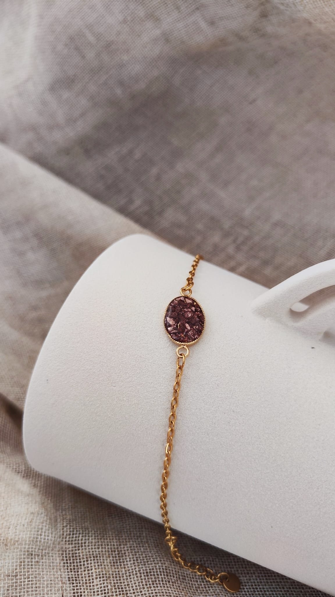 Le Bracelet Uluru séduit par son éclat intense et sa finesse. Sa chaîne dorée délicate met en valeur un médaillon central prune profond, composé de cristaux de verre qui captent la lumière avec élégance.