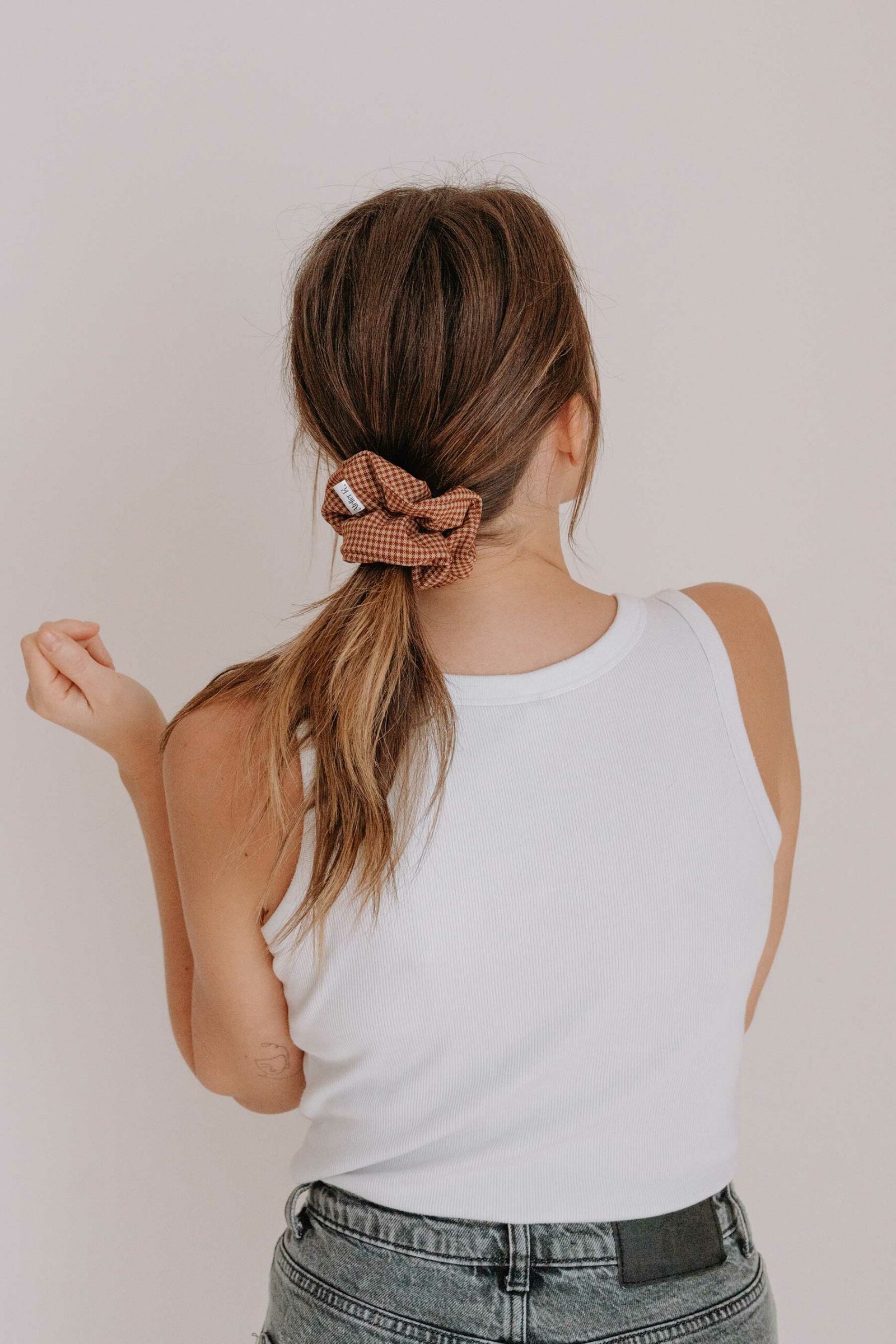 Ses nuances marron et beige s’accordent facilement avec une garde-robe neutre ou colorée. Que vous le portiez sur un chignon bas, une queue-de-cheval ou autour du poignet, il rehausse instantanément votre look d’une note rétro chic.