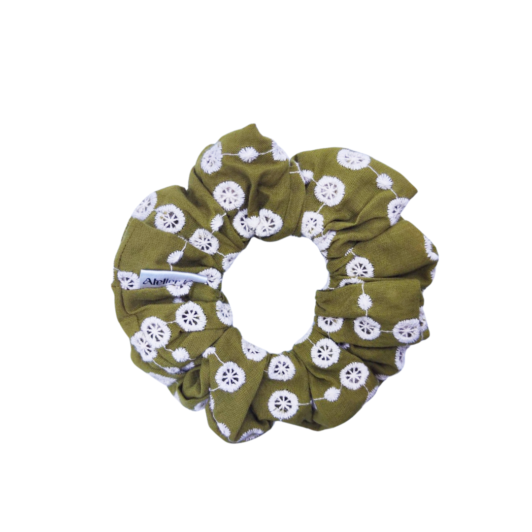 Le chouchou Honfleur en broderie anglaise verte est une invitation à la douceur et à l’élégance naturelle. Confectionné à la main dans notre atelier en Bretagne, il sublime chaque coiffure d’une touche artisanale et raffinée.