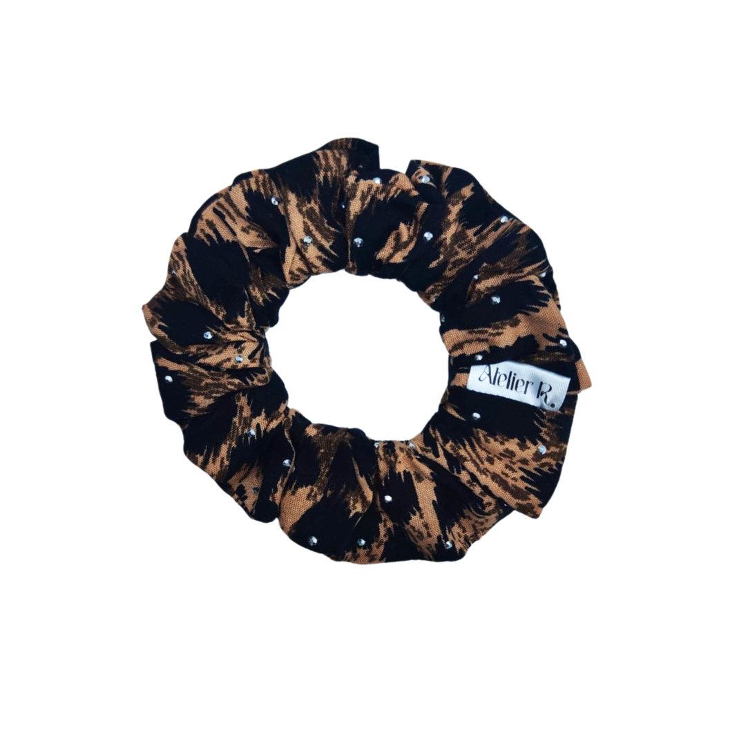 Inspiré par la beauté sauvage du motif léopard, le Chouchou Lessay se distingue par son jeu de contrastes entre les teintes brunes et noires, rehaussées par l’éclat discret des strass. Ce mariage de textures et de reflets en fait un accessoire unique, parfait pour celles qui aiment allier caractère et féminité. Grâce à sa finition soignée, il se porte aussi bien au quotidien que pour une occasion spéciale.