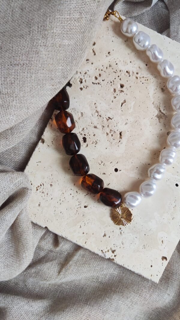 D’un côté, les perles marron aux reflets ambrés rappellent la richesse des matières naturelles et la chaleur de la terre. De l’autre, les perles blanches nacrées apportent une touche de lumière douce et intemporelle.