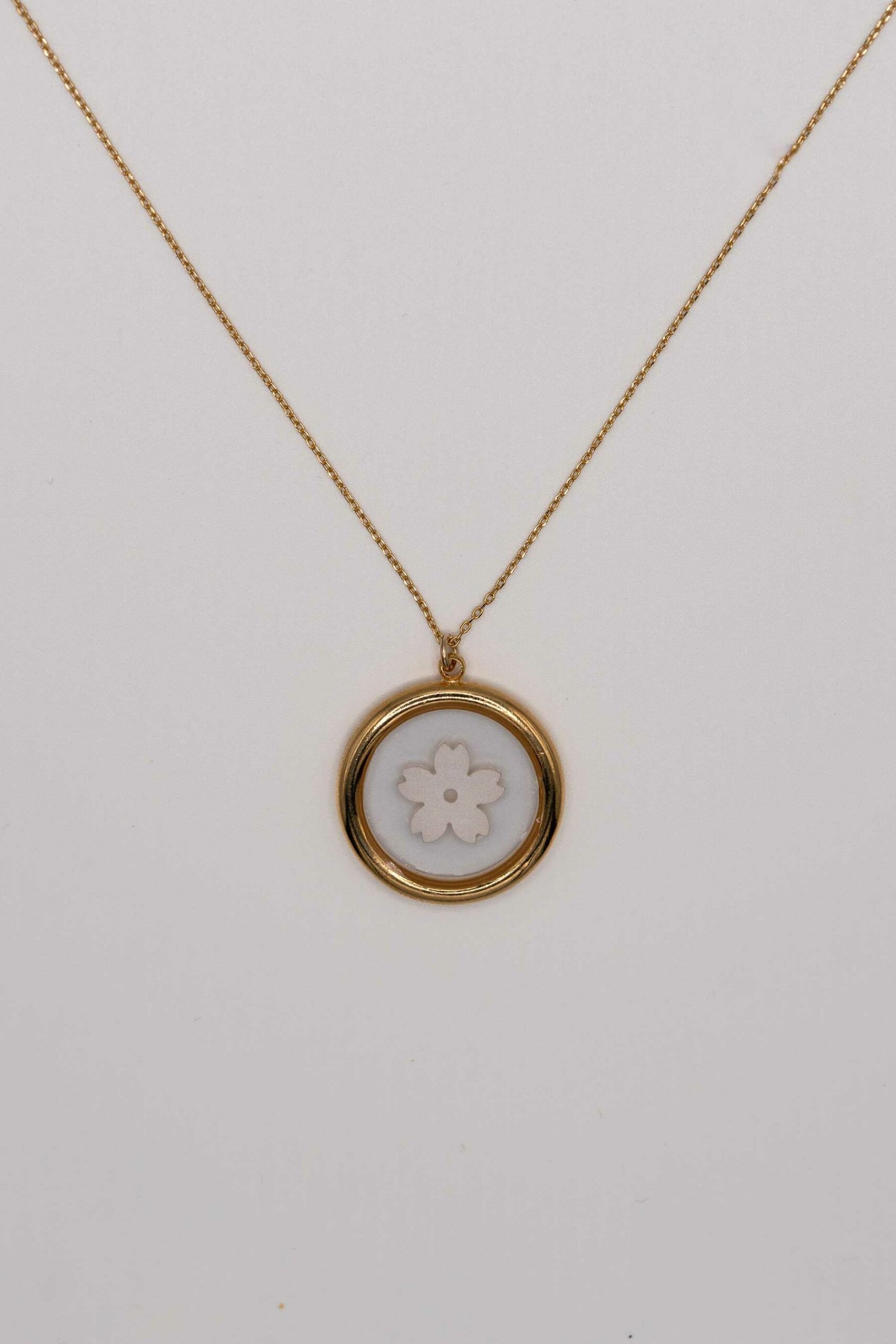 Chaque collier est une petite œuvre d’art où la transparence de la résine laisse apparaître la fleur nacrée dans toute sa légèreté. L’éclat doré du cadre souligne avec délicatesse la blancheur de la fleur, offrant un contraste lumineux et apaisant.