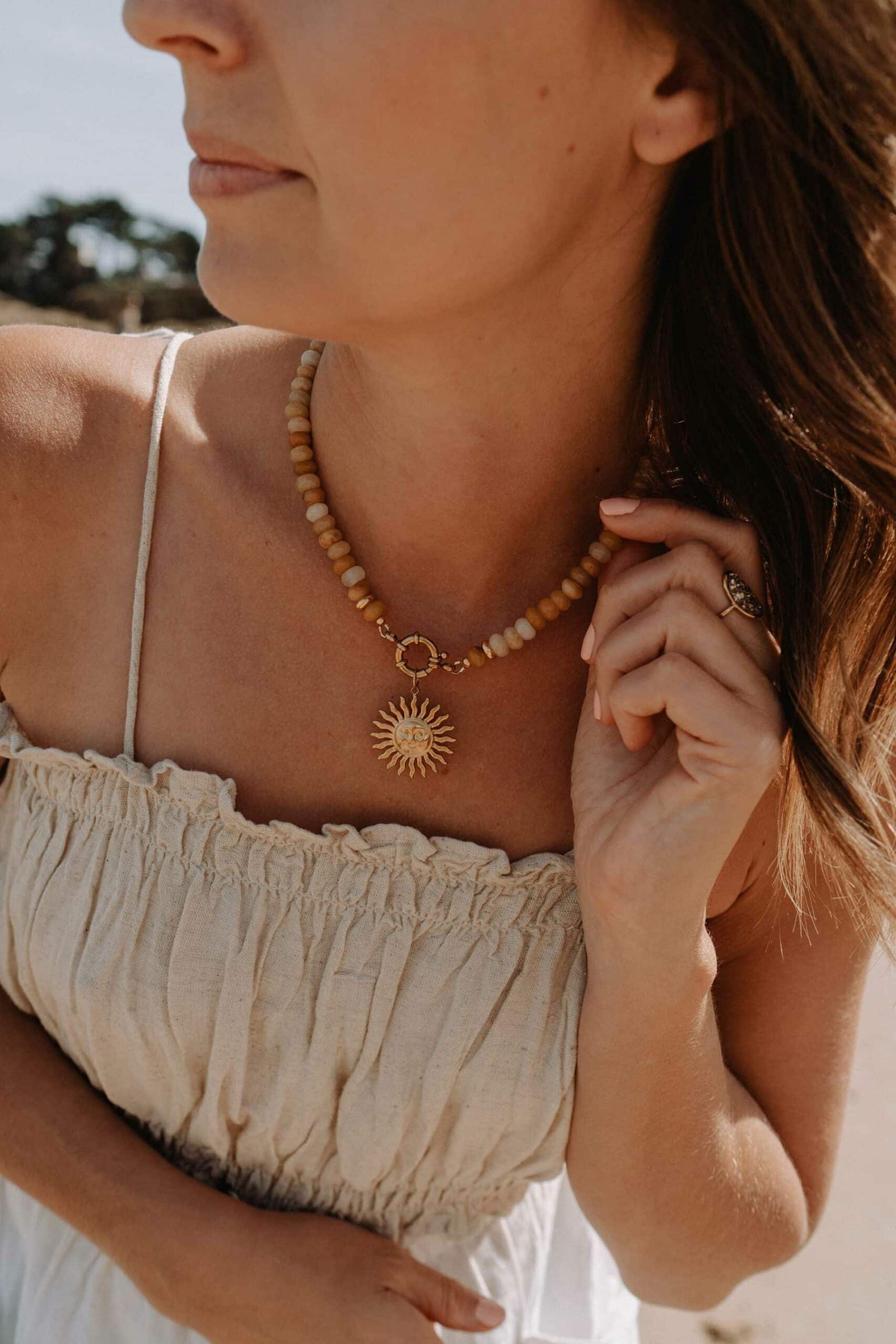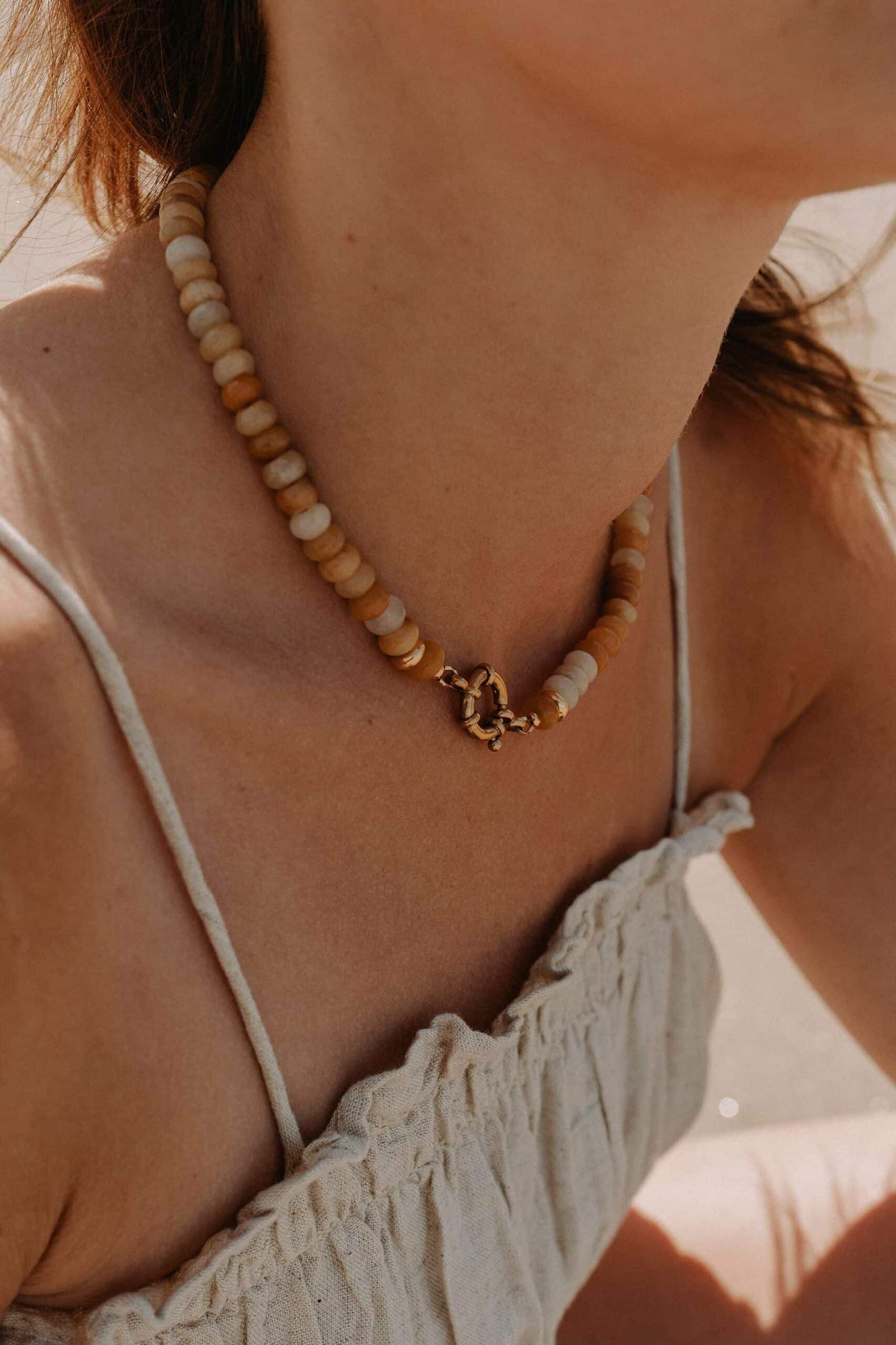 Le Collier Bacalar est une ode aux journées lumineuses et aux tenues légères. Ses perles en jade teintée, aux nuances sable chaudes et naturelles, illuminent instantanément votre look. Dès que vous le portez, il apporte une douceur solaire et une élégance décontractée.