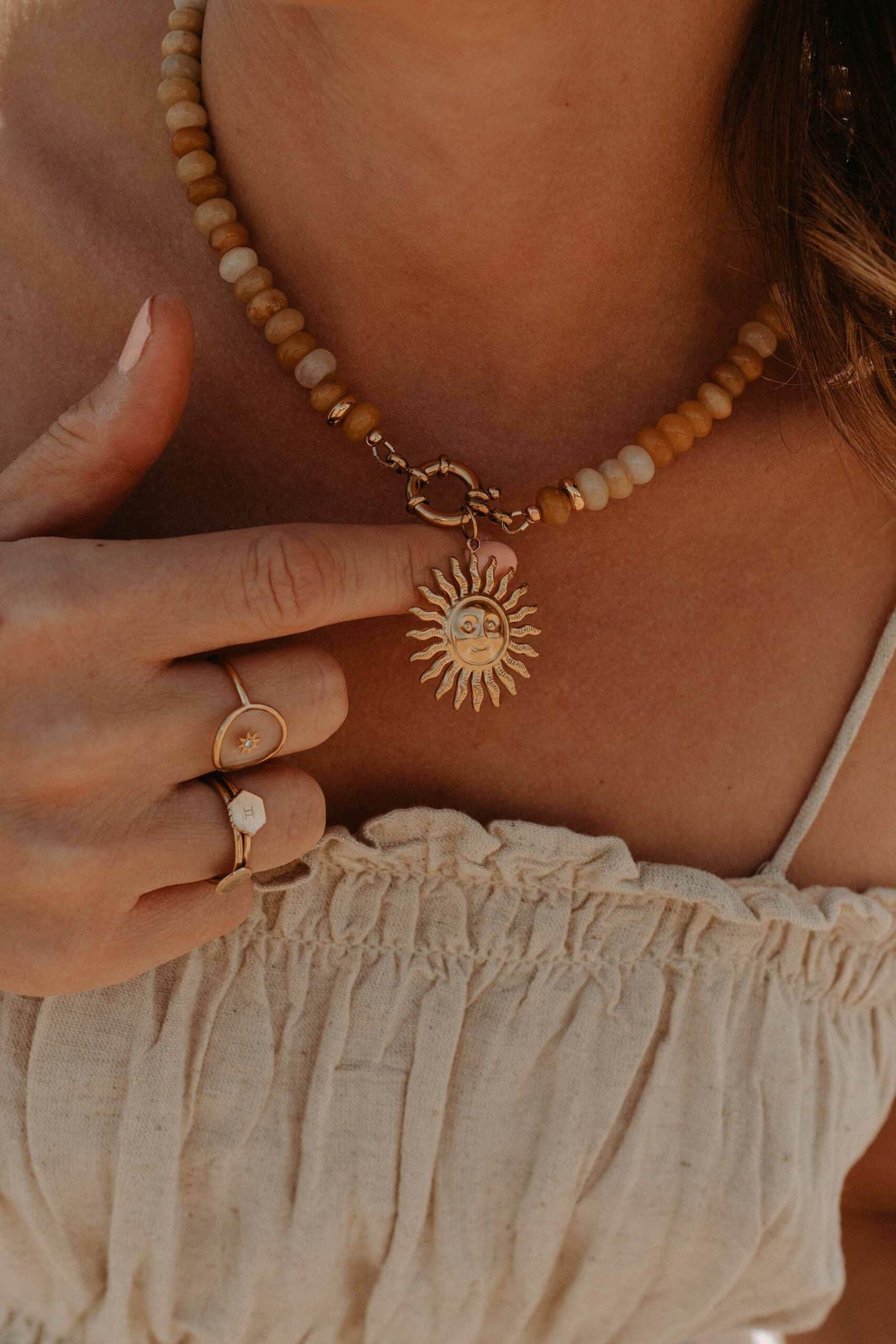 🧡 Pourquoi on l’adore : parce qu’il allie l’éclat des pierres gemmes à la douceur de l’or. Ses perles en jade teintée font ressortir les teints dorés comme les peaux claires, et son pendentif permet de changer de style d’un jour à l’autre. De plus, c’est un bijou lumineux, adaptable et pensé pour rayonner avec vous.