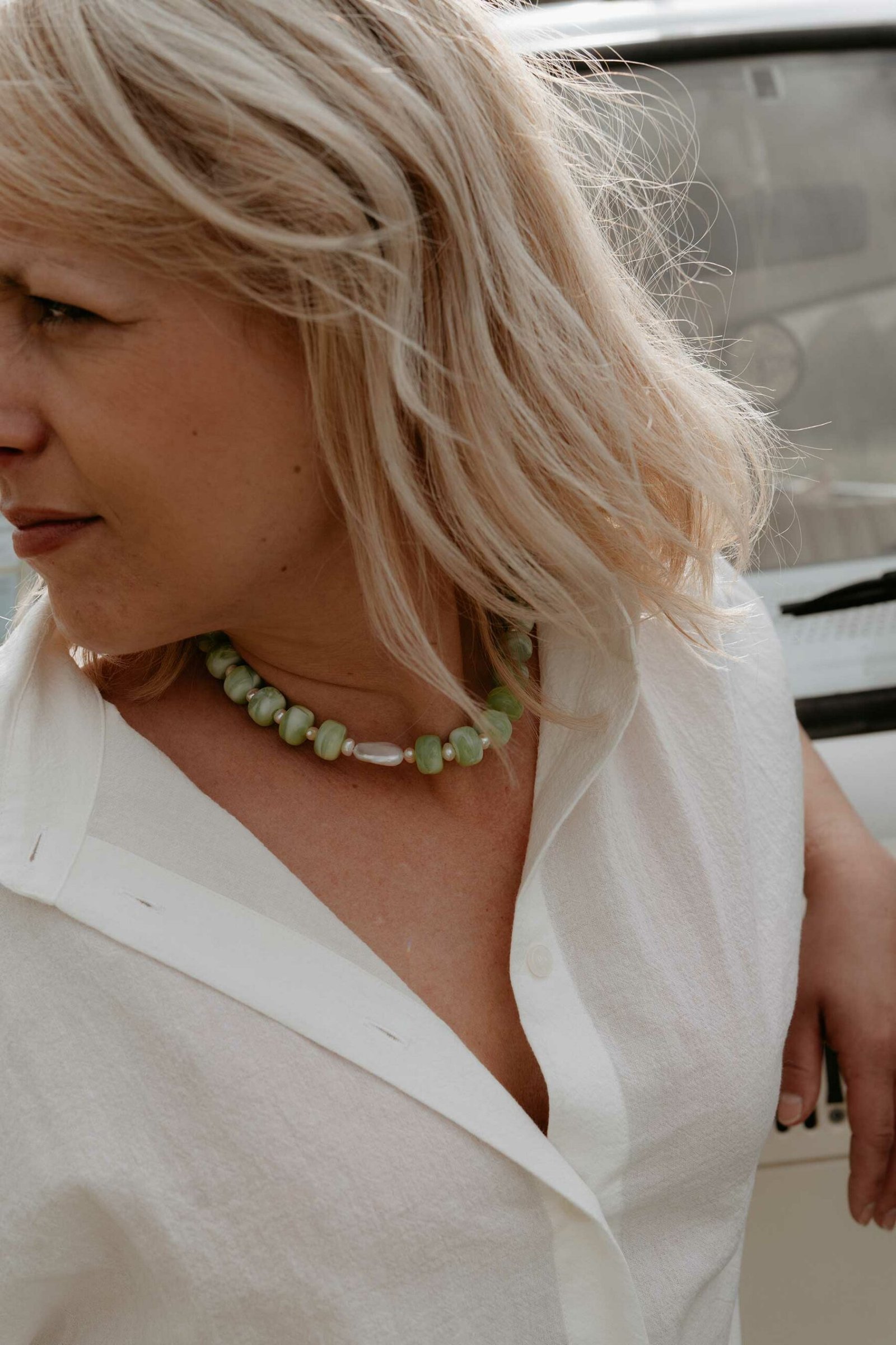 Au centre du collier, une perle d’eau douce rectangulaire attire le regard par son éclat délicat. Sa forme irrégulière souligne l’authenticité du bijou et crée un contraste subtil avec les perles vertes.