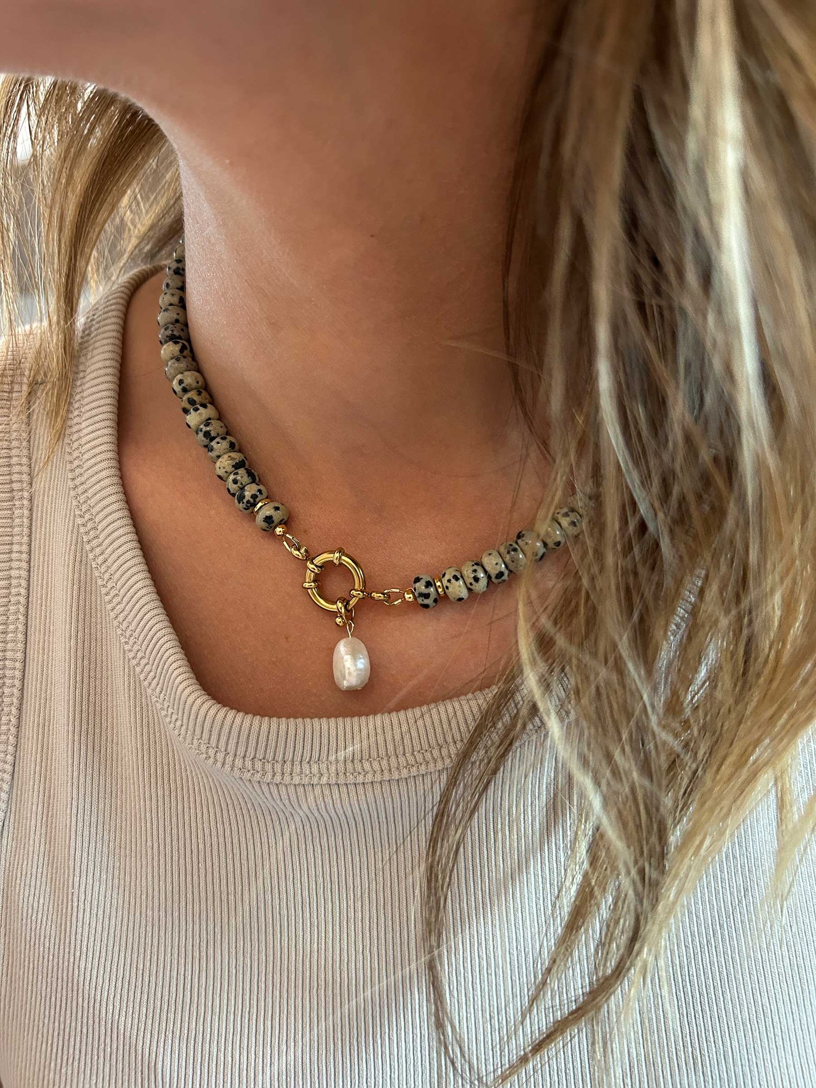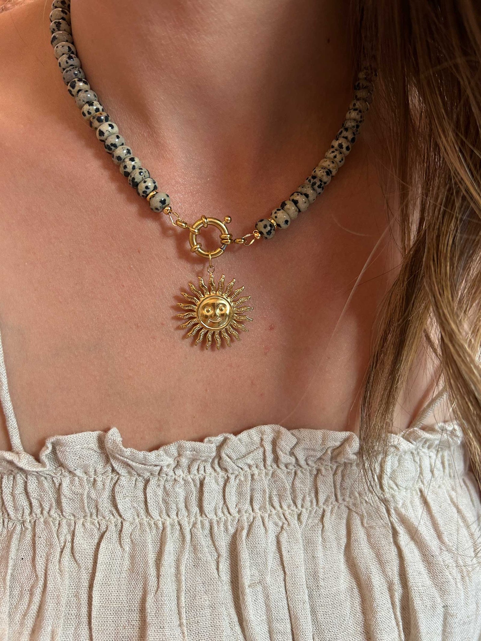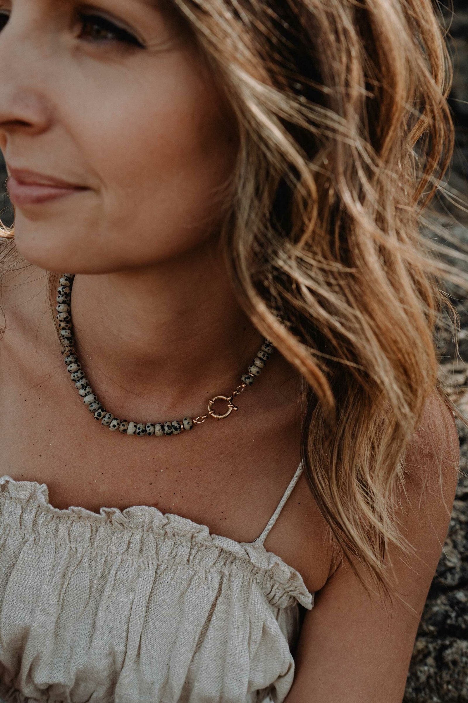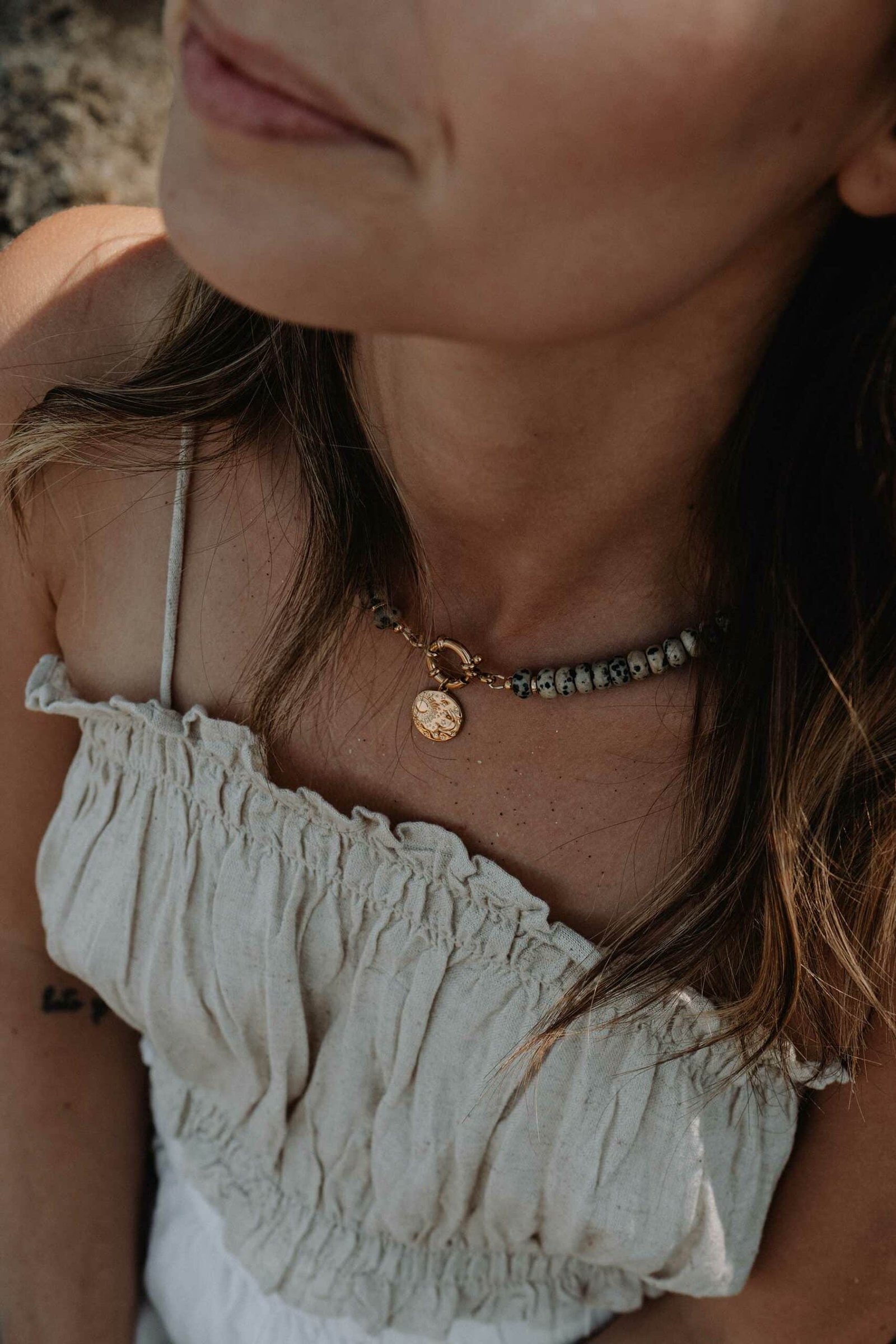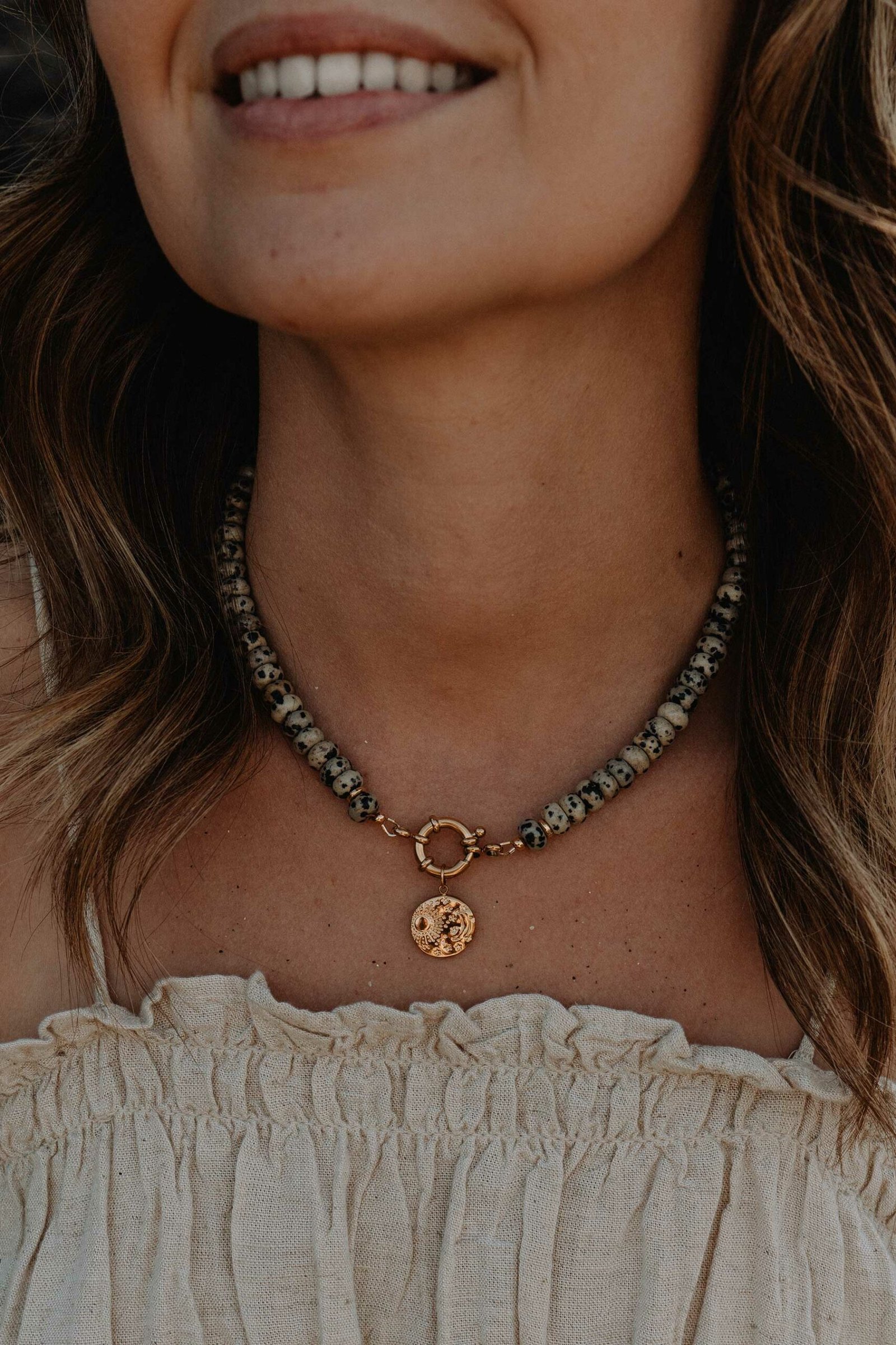 Le Collier Cozumel est un bijou solaire et unique, pensé pour révéler votre personnalité. Ses perles en jaspe dalmatien, aux taches noires sur fond beige, apportent texture et douceur à votre look. Dès la première seconde, il attire les regards.