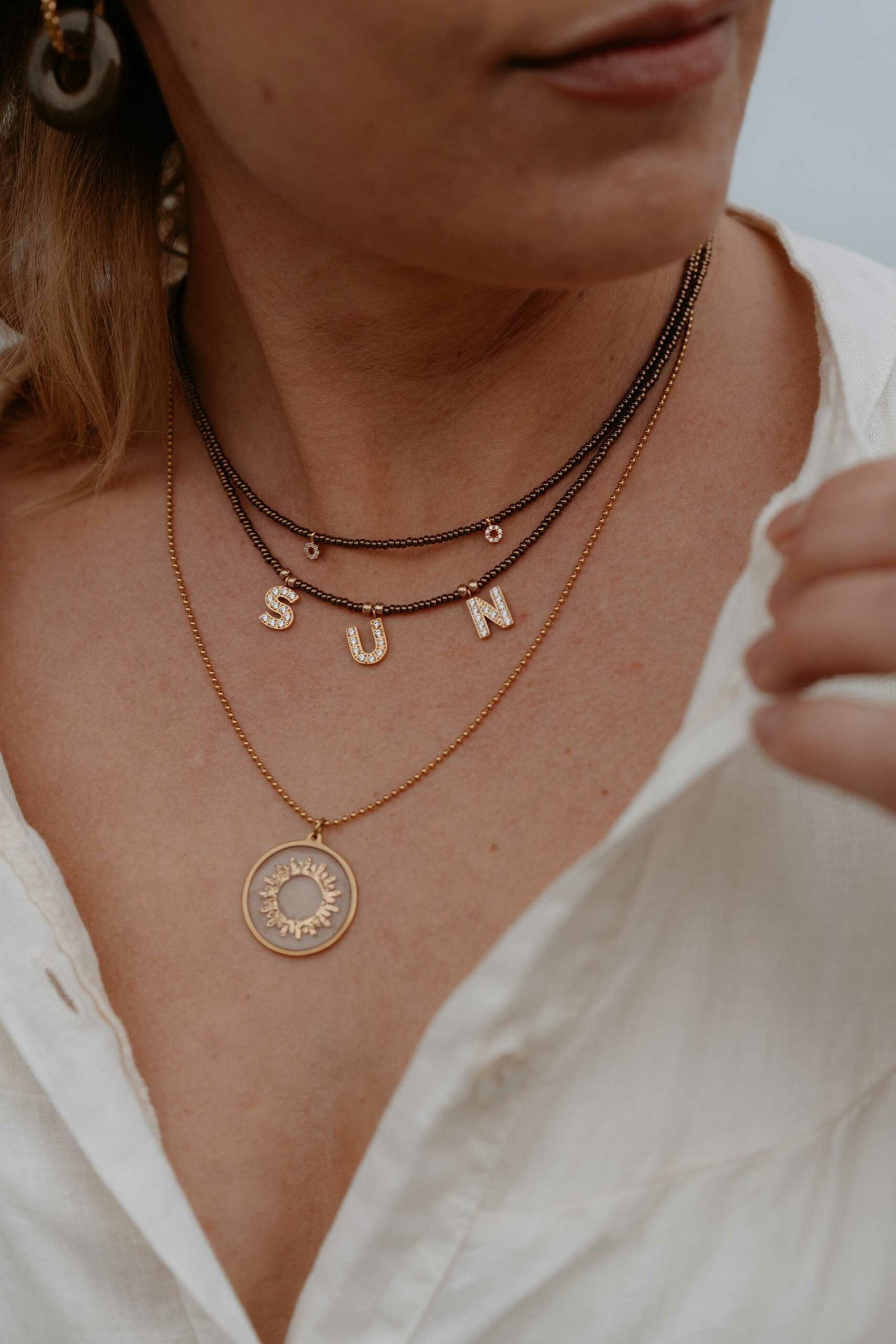 Le Collier Gladstone est une invitation à porter un message lumineux au quotidien. Composé de perles de rocaille aux nuances gold bronze et de trois breloques lettres formant le mot « sun », il évoque la chaleur, la lumière et l’énergie des beaux jours.