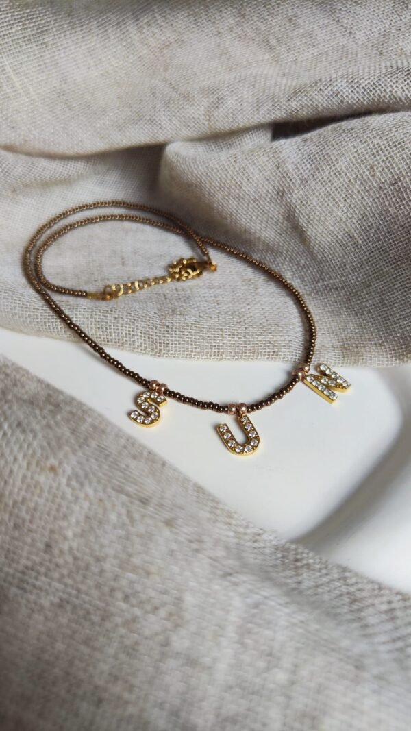 Réalisé avec soin, ce collier associe perles de rocaille et éléments dorés à l’or fin. Les breloques lettres, serties d’oxydes de zirconium, apportent une touche précieuse tout en conservant une grande délicatesse.