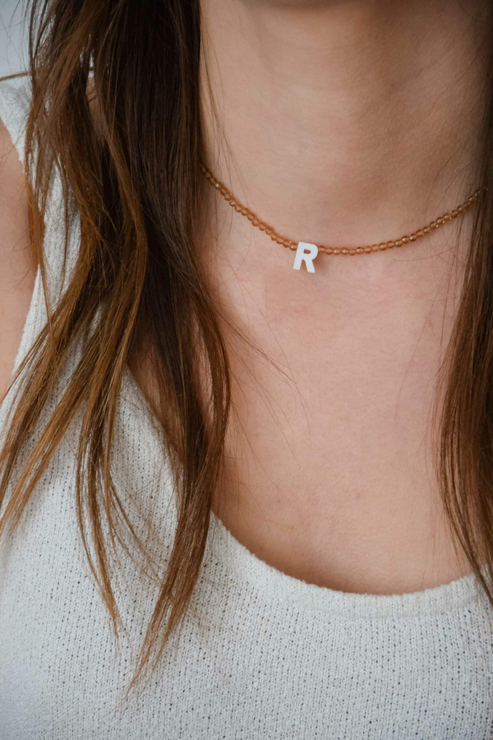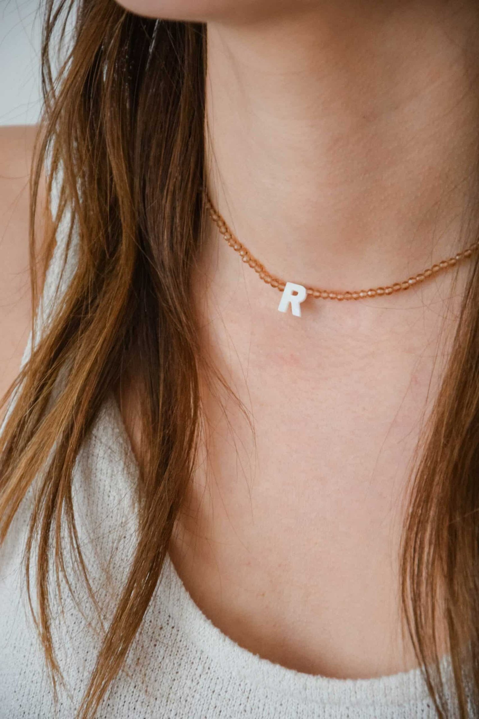 Collier personnalisable en perles facettées topaze clair et lettre en nacre