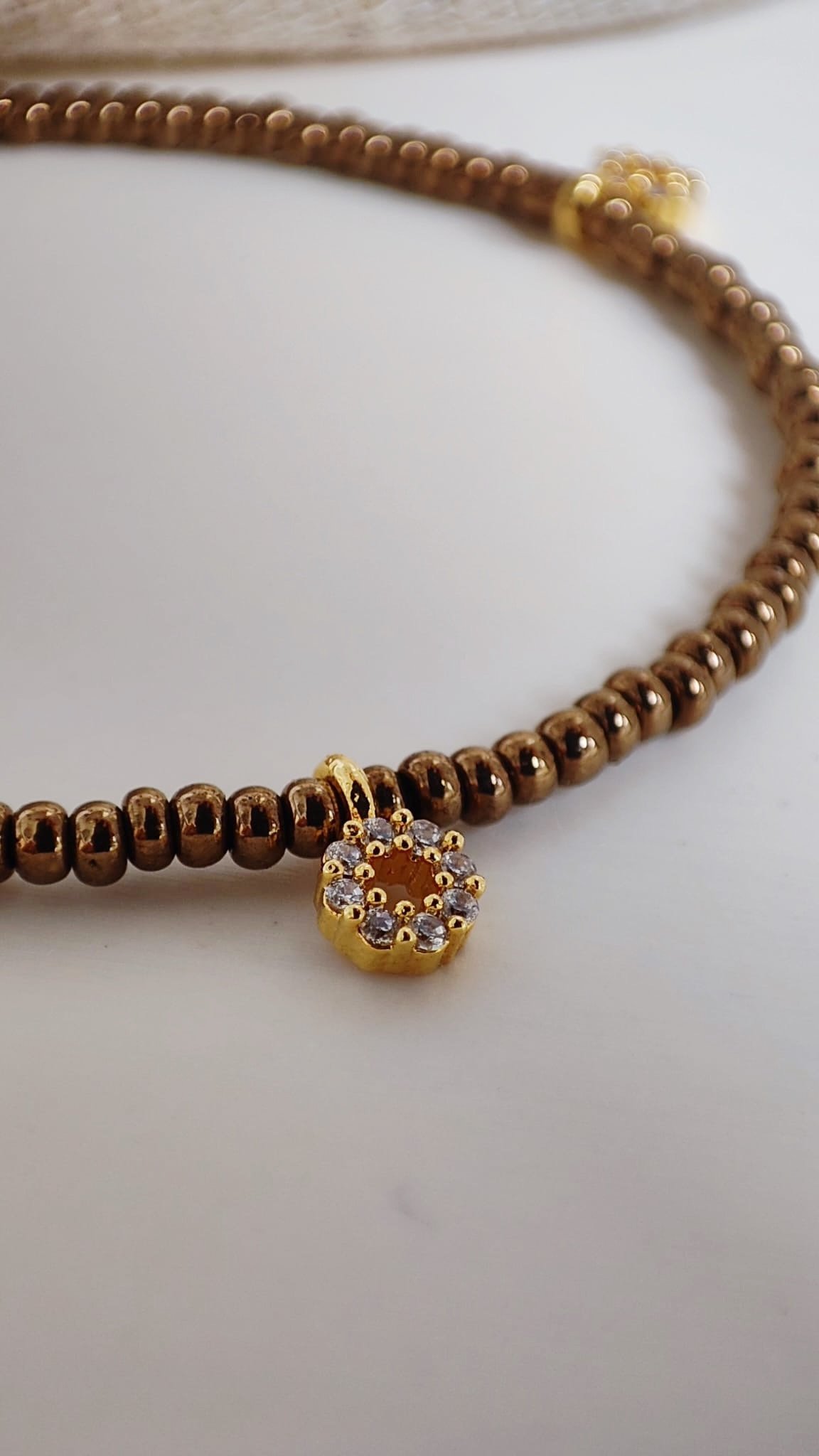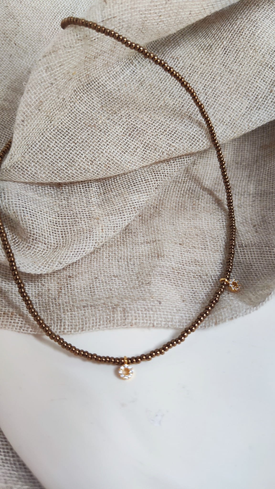 Chaque collier est réalisé avec soin, associant perles de rocaille et éléments dorés à l’or fin. Les breloques ornées d’oxydes de zirconium apportent une touche précieuse tout en conservant la délicatesse de l’ensemble.