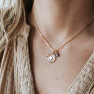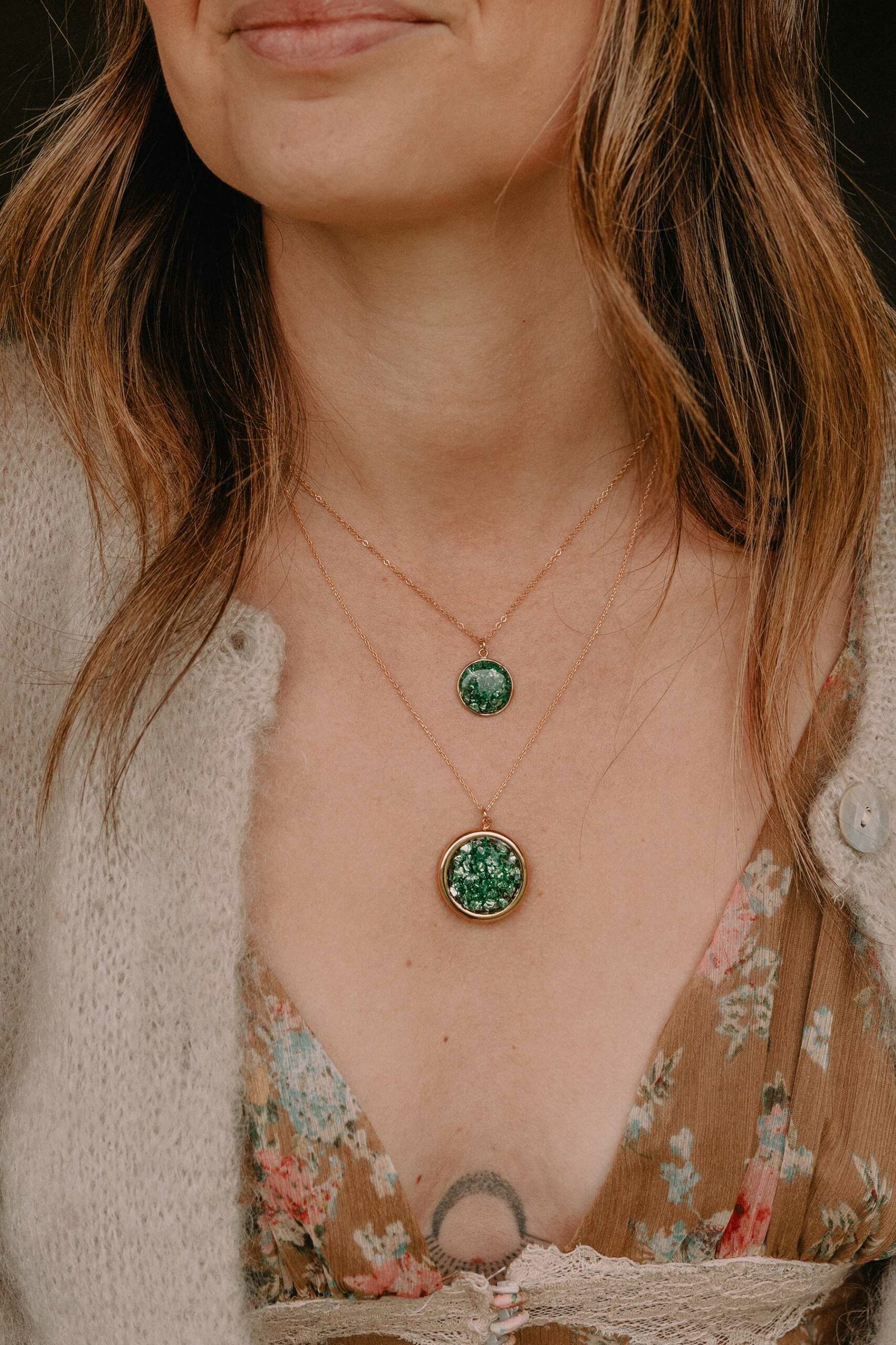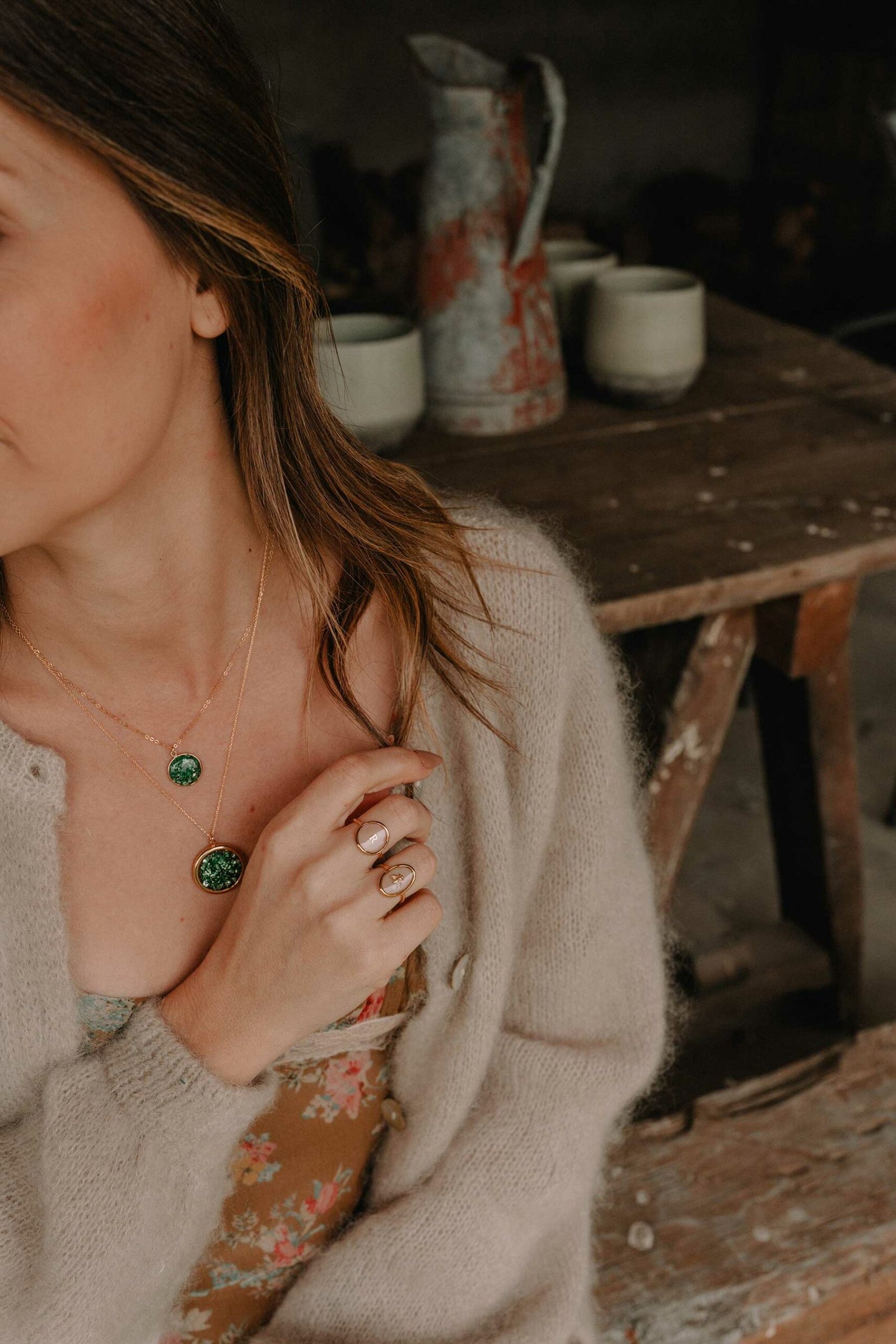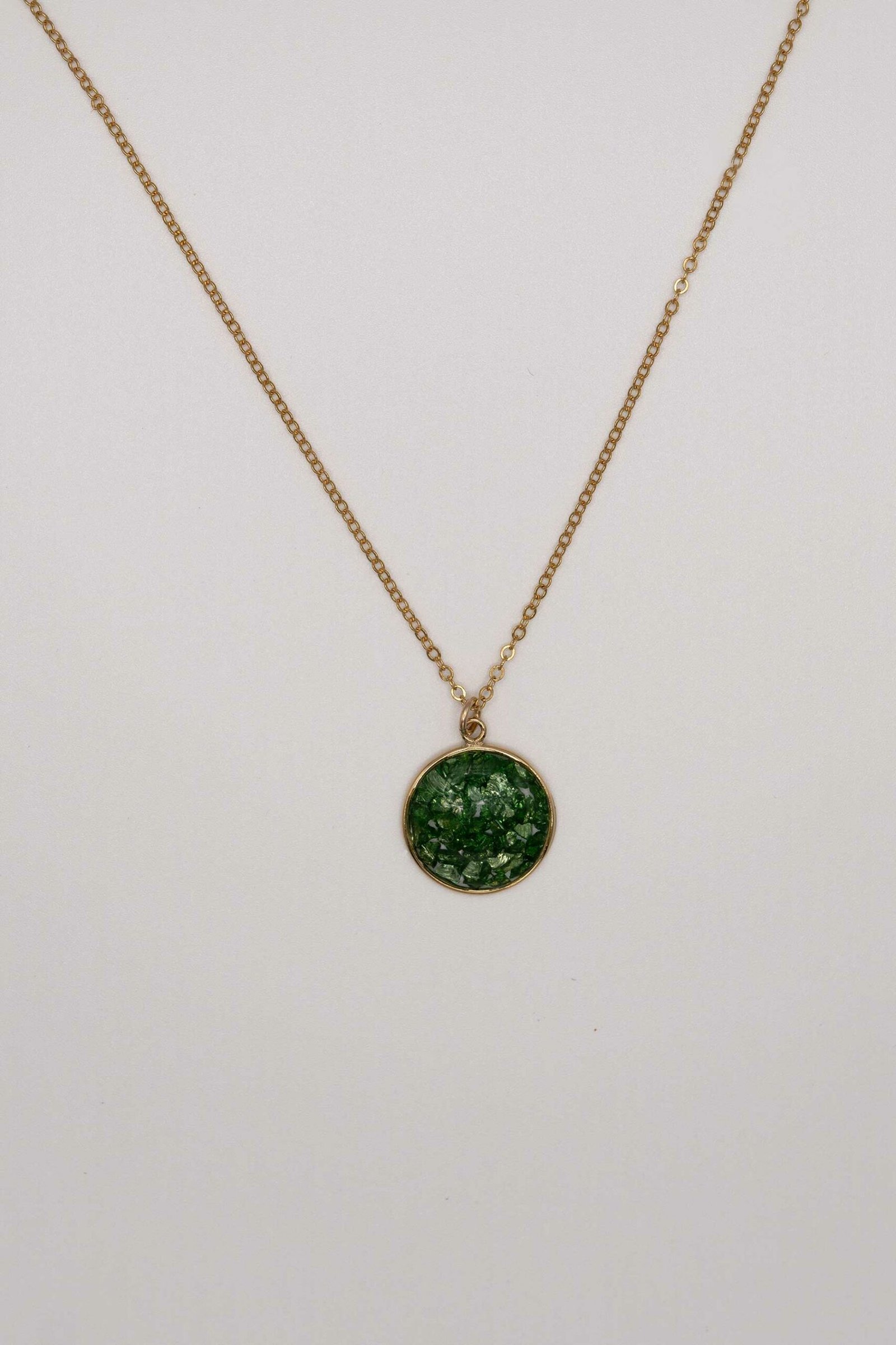 Le Collier Paris – Vert mêle délicatesse et caractère dans un design moderne et intemporel. Son médaillon en gold filled accueille une résine coulée à la main dans laquelle sont incrustés de subtils éclats de verre vert. Un bijou lumineux et texturé, pensé pour sublimer votre allure au quotidien.