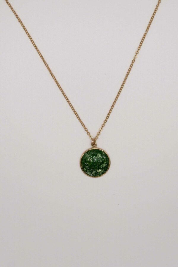 La profondeur du vert se marie à l’éclat doré du médaillon pour créer un jeu de reflets captivant. Chaque pièce est unique, les fragments de verre se positionnant différemment à chaque création, comme un petit paysage minéral emprisonné dans la résine.