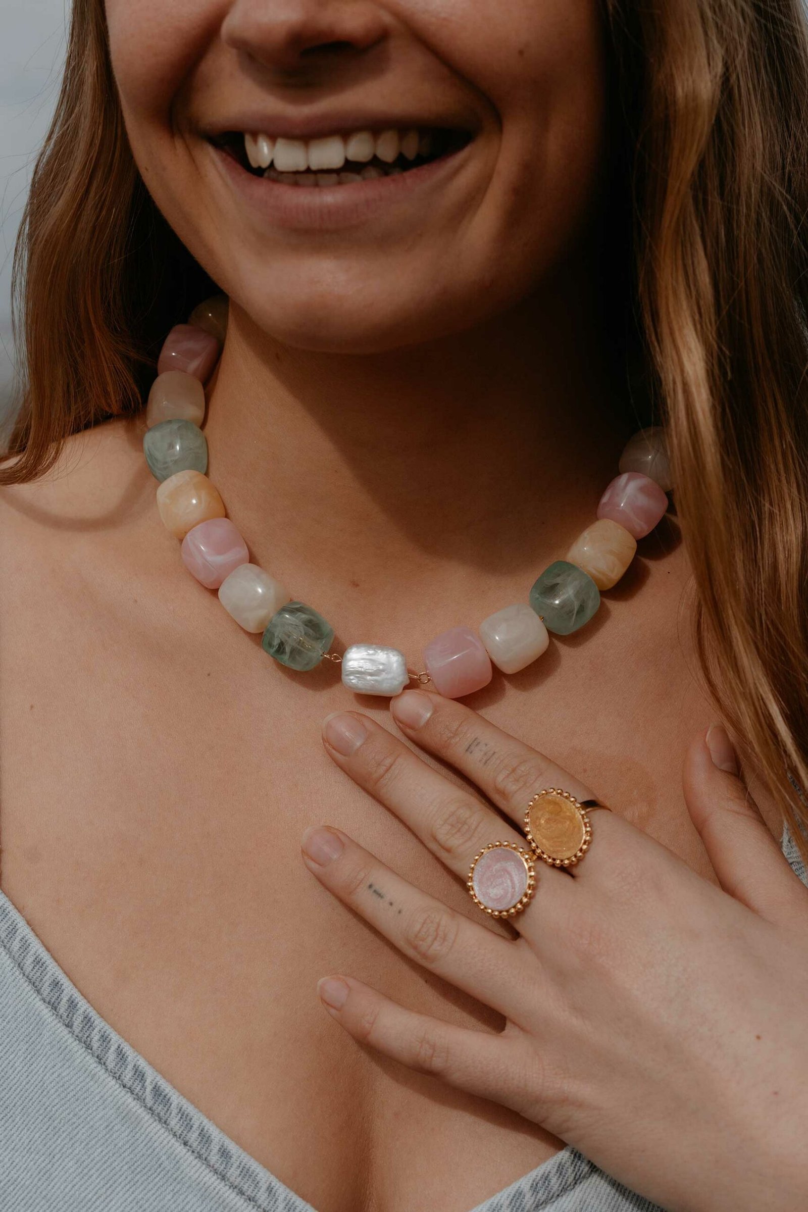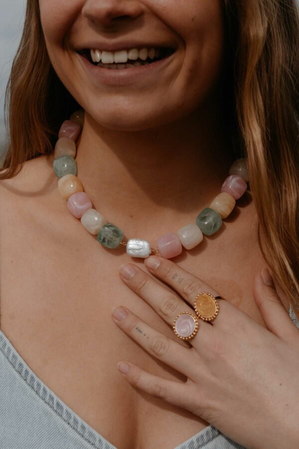 Les nuances délicates de ce collier rappellent les couleurs d’un ciel d’été ou les reflets d’une plage au lever du jour. Chaque perle translucide capte la lumière avec subtilité, créant un effet à la fois frais et apaisant.