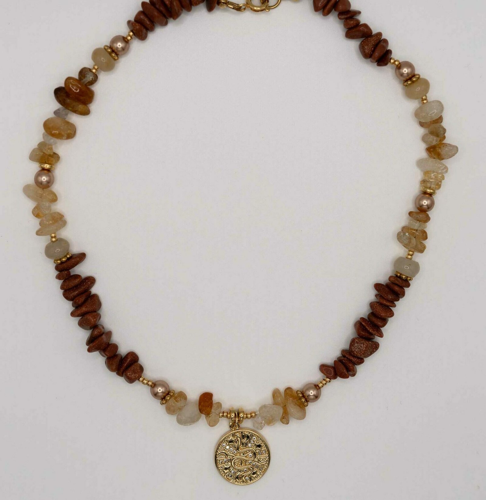 Les nuances dorées, brunes et ambrées des perles s’harmonisent parfaitement avec la brillance du pendentif en zirconium. Ce mélange de matières précieuses et de détails délicats en fait un bijou raffiné, à la fois énergisant et élégant.
