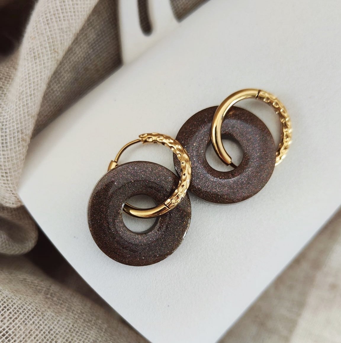 Les pendentifs en résine adoptent une forme circulaire épurée, symbole d’élégance et d’équilibre. Leur finition marron pailleté capte délicatement la lumière, pour un rendu subtil et raffiné.