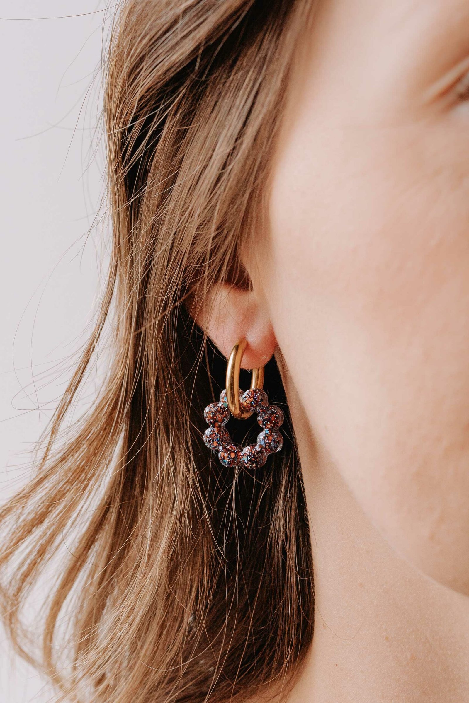 Les Créoles Byron Sépia font partie de la collection de créoles interchangeables : vous pouvez les porter avec leurs fleurs scintillantes pour un look vibrant, ou bien avec d’autres pendentifs de la même gamme pour varier les styles. Une création artisanale pensée pour s’adapter à toutes vos envies.