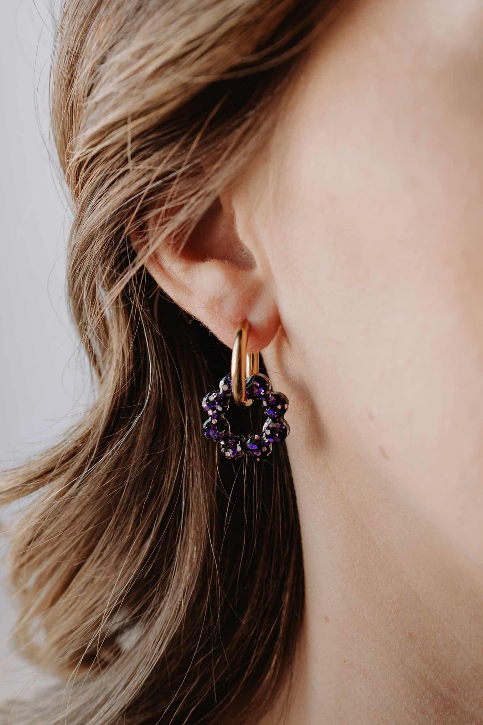 Ainsi, les créoles Byron Sombra habillent vos oreilles d’une couleur profonde aux éclats changeants. Le noir apporte chic et modernité, tandis que les reflets violets créent une touche glamour et originale. De plus, leur format délicat permet de les porter au quotidien comme lors d’occasions spéciales.