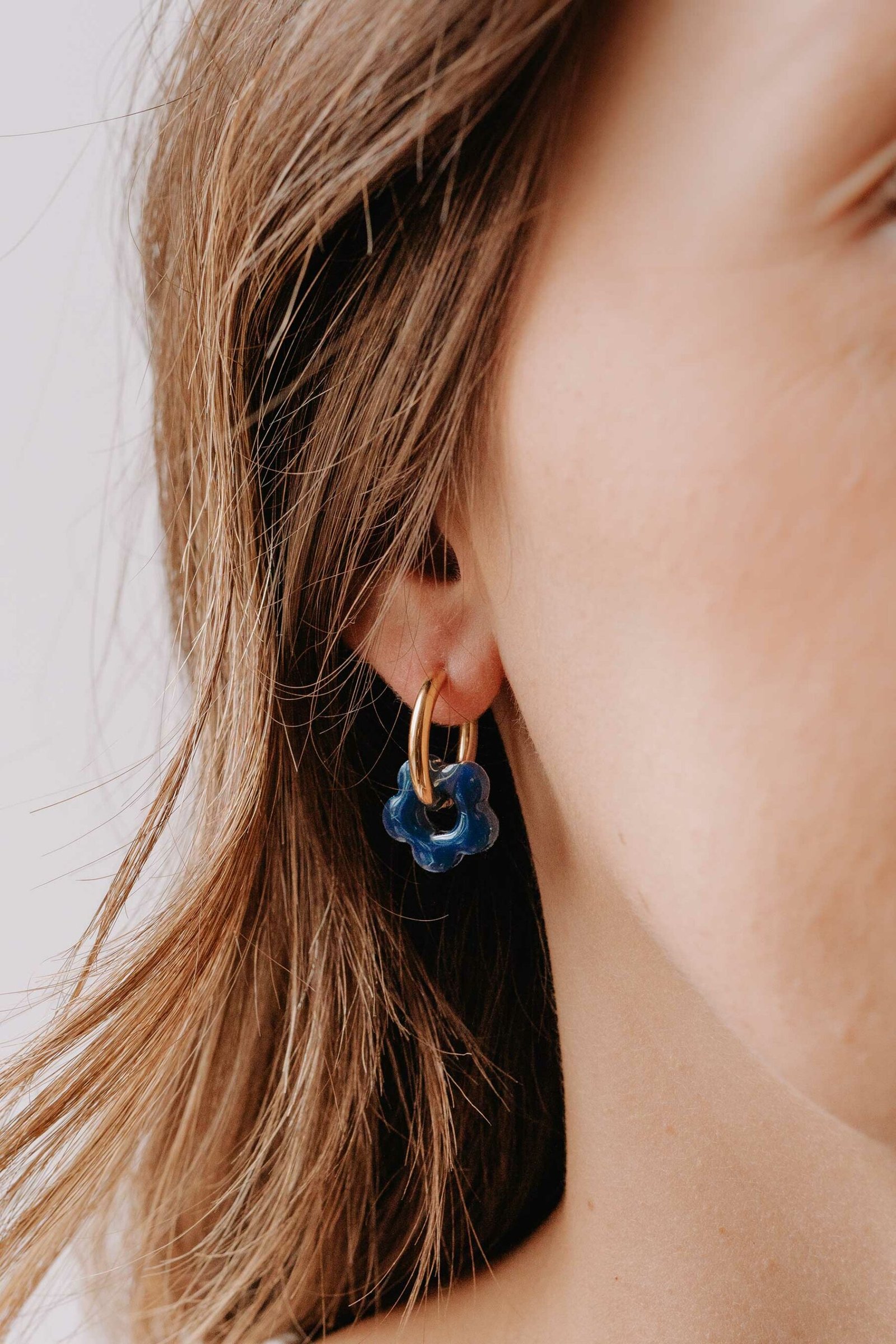 Chaque fleur est soigneusement façonnée à la main dans une résine hautement qualitative, puis montée sur des créoles en acier inoxydable doré, résistantes à l’eau. La finition brillante du bleu profond capte la lumière et souligne la féminité du visage.
