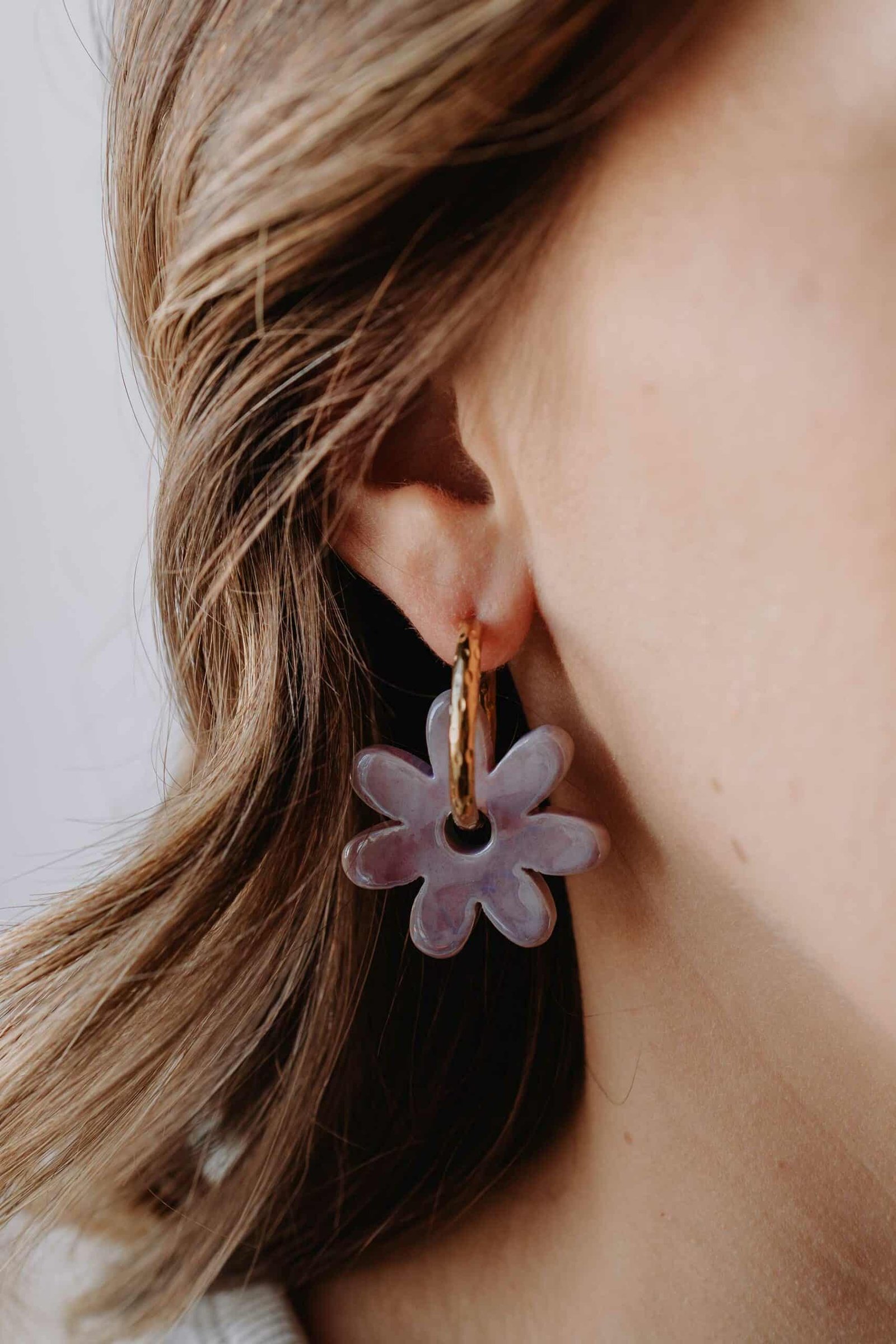 Chaque paire est assemblée à la main avec soin, pour garantir un rendu harmonieux et une belle durabilité. Les fleurs en céramique (3 cm de diamètre) sont légères, solides et réalisées dans des teintes lavande légèrement nuancées, qui captent la lumière avec élégance. Les créoles en acier inoxydable doré (26 mm) assurent confort et résistance, même au contact de l’eau.