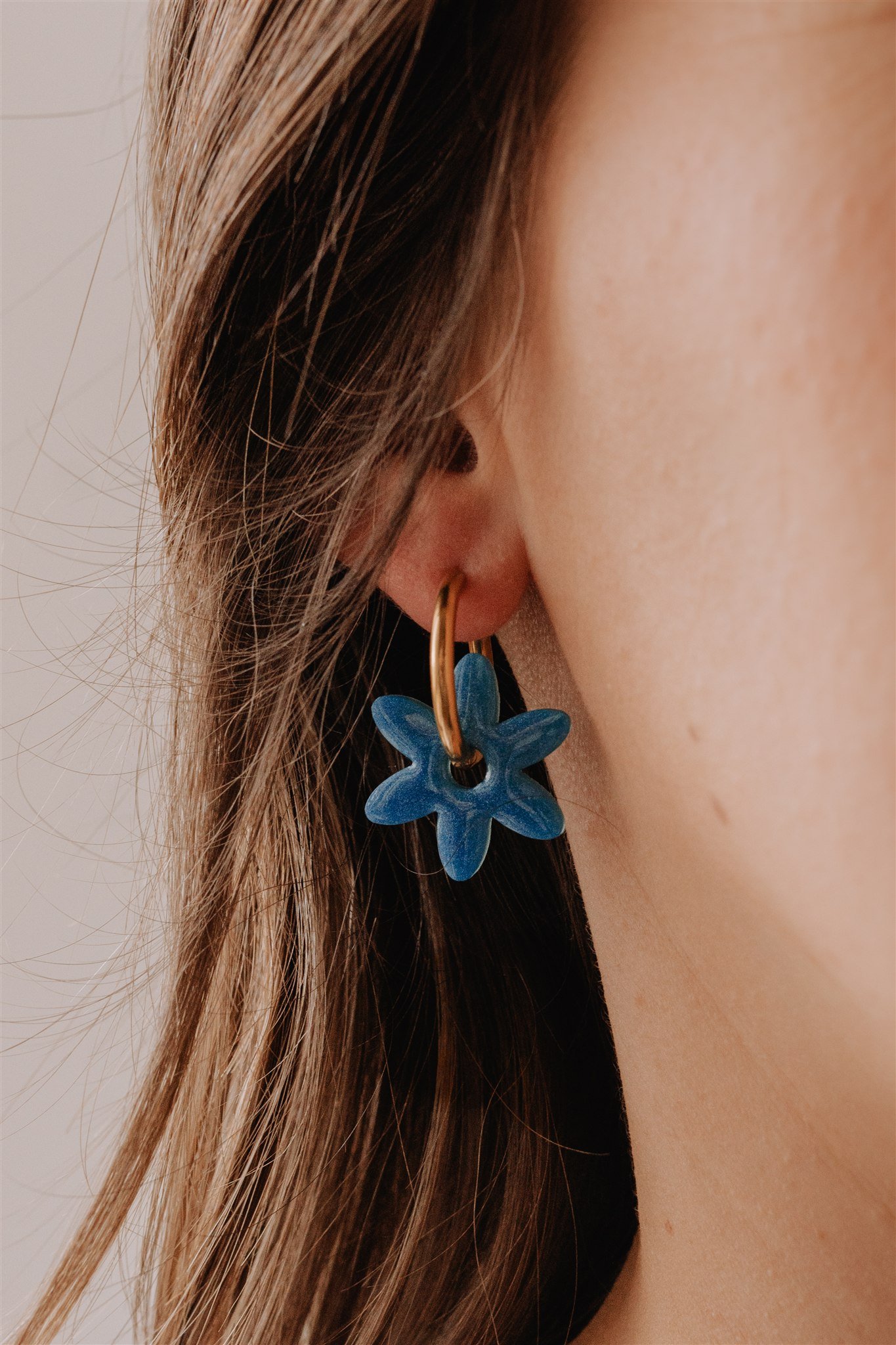 Les fleurs en résine bleu lagon captent délicatement la lumière et rappellent les reflets de l’eau. Leur forme florale apporte une note féminine et aérienne, parfaite pour sublimer vos tenues.