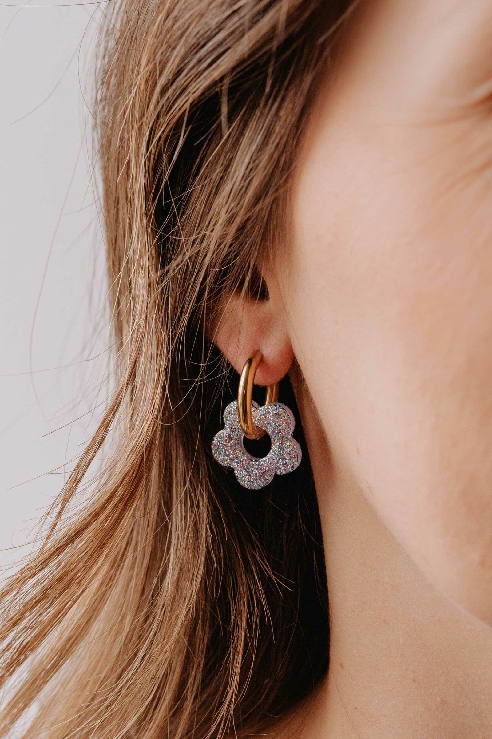 Les fleurs en résine pailletée sont soigneusement moulées, poncées et montées sur des créoles dorées en acier inoxydable, résistantes à l’eau et au temps.
