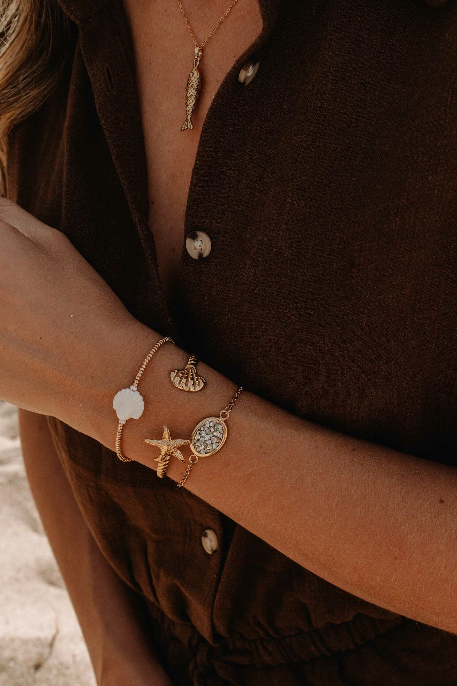 À la fois élégant et décontracté, le Jonc Sayulita capte à lui seul l’esprit de l’été : un coquillage, une étoile de mer, une lumière dorée… Il suffit de l’enfiler pour avoir l’impression de revenir d’une plage de l’autre bout du monde. Il se glisse au poignet le matin, et ne vous quitte plus de la journée.