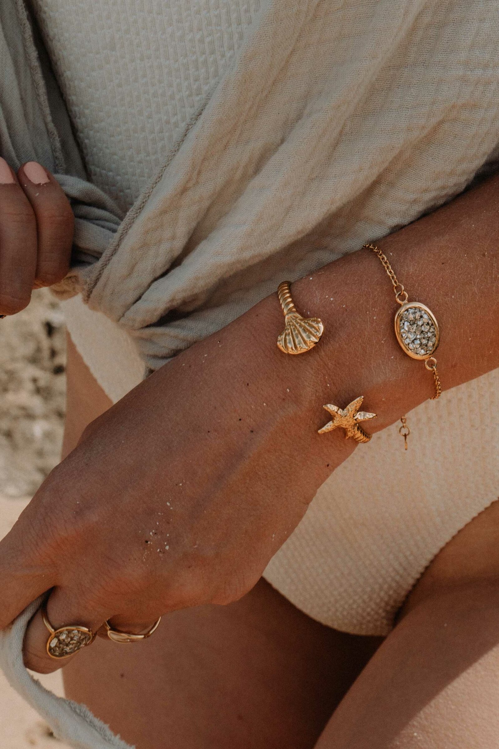 Le jonc doré Sayulita évoque un plongeon en eaux turquoise. Un coquillage d’un côté, une étoile de mer de l’autre : il capture l’esprit de l’été et le garde contre votre peau. Dès que vous le portez, il diffuse un éclat solaire et un doux parfum d’évasion.